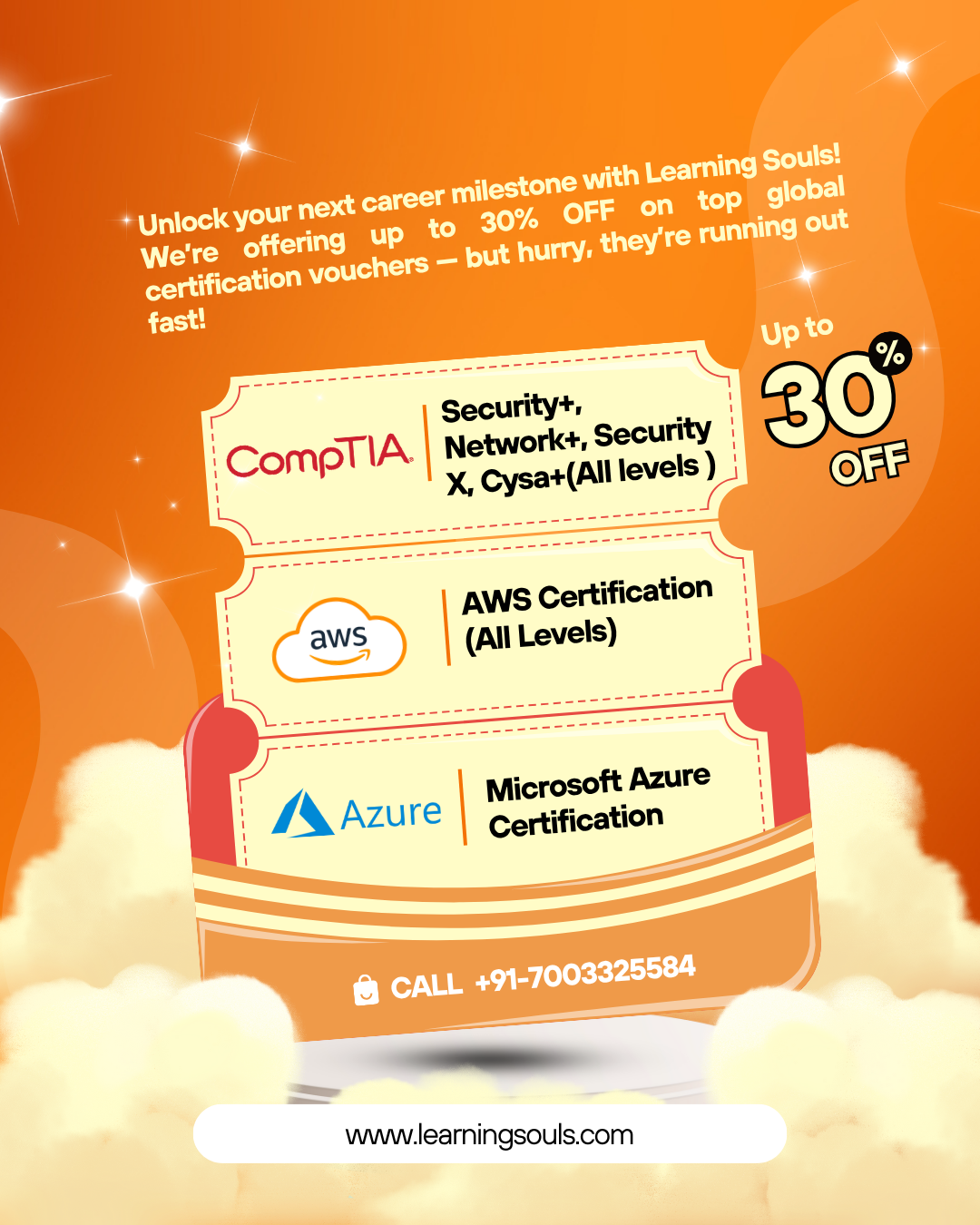 At Learning Souls, we’re excited to offer exclusive discounts — up to 30% off — on most global IT certification vouchers. This limited-time offer is designed to help learners and professionals validate their skills without financial barriers.